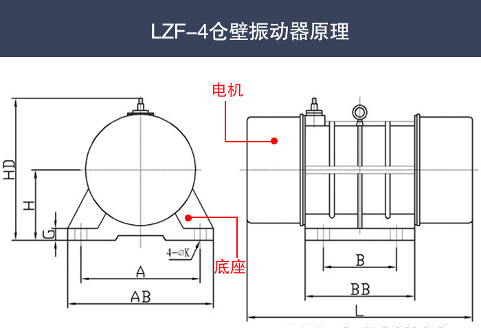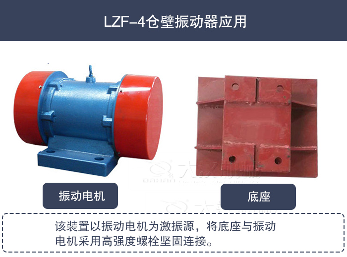 LZF-4倉壁振動器是應(yīng)用振動電機(jī)的一個典型實例。該裝置以振動電機(jī)為激振源,將底座與振動電機(jī)采用高強(qiáng)度螺栓堅固連接。